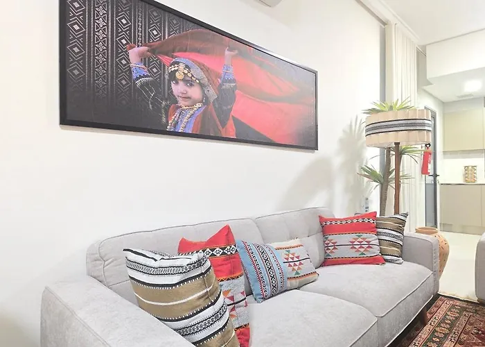 Das 74 m² große Modern Omani Inspired Apartment in Maskat liegt in Maskat, circa 3 Kilometer vom Falaj entfernt, und bietet einen Infinity-Pool mit einen Poolzaun. Die Mohammed Al Ameen Moschee ist in einer Entfernung von 25 Gehminuten vom Apartment.